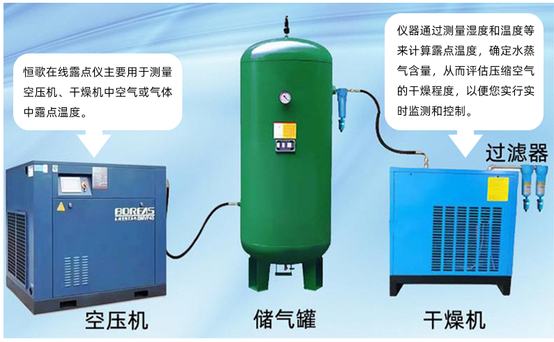 吸附式干燥機:HG602系列露點變送器可安裝在吸附式干燥機的出口處,用于監測經過吸附處理后的壓縮空氣的露點溫度。憑借其高精度測量和快速響應能力,能夠及時發現濕度異常,并通過與干燥機控制系統的聯動,自動調整吸附劑的再生周期,確保壓縮空氣的濕度始終符合要求。